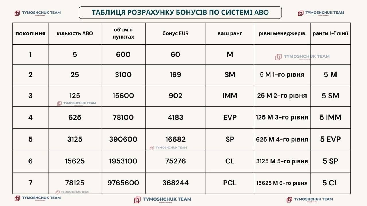 Таблиця приблизних розрахунків бонусів по системі АВО (5 по 5)